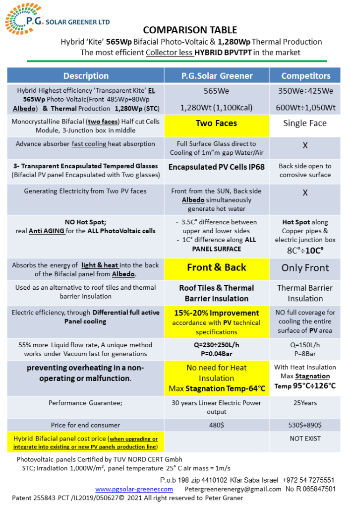פאנל זה, בעל עיצוב ייחודי של זכוכית כפולה דו-צדדית עם מערכת תרמית שקופה (KIT), מצטיין ברמות גבוהות במיוחד (פי -3) של ייצור אנרגיה חשמלית ומים חמים סולארי.