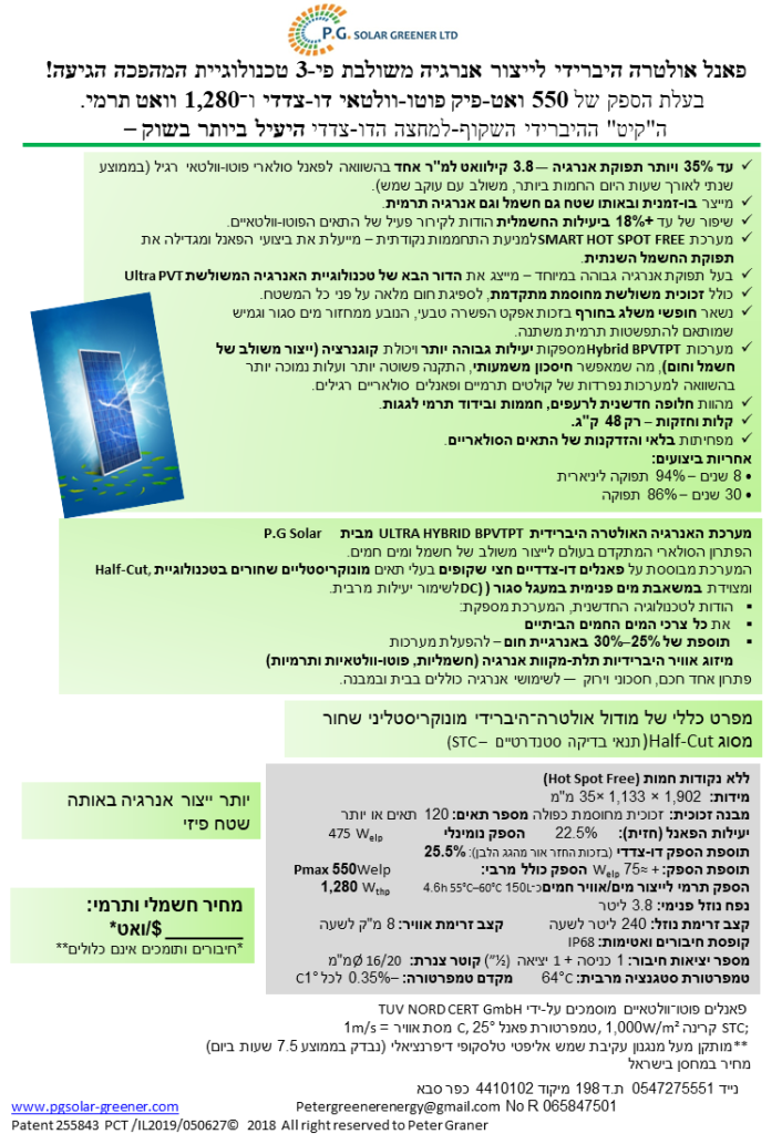 פאנל היברידי תלת-עוצמתי מסוג PVT הכולל פאנל PV דו-צדדי (Bifacial Photovoltaic) עם 2-זכוכיות אטום לחלוטין (IP-68) ויחידה תרמית שקופה Thermal (שימוש בחום השיורי של הפאנל החשמלי סולארי). זרימת המים יוצרת הולכת החום למים ומכאן קירור הפאנל PV חשמלי שמגדיל את נצילות ייצור החשמל בכ 15%.