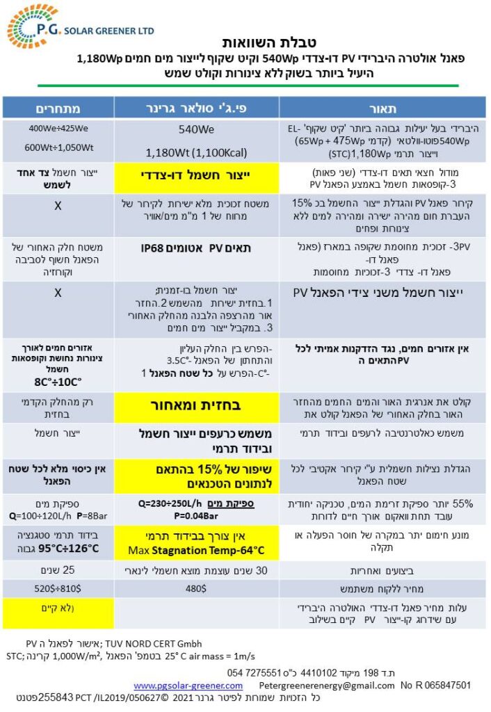 פאנל היברידי תלת-עוצמתי מסוג PVT הכולל פאנל PV דו-צדדי (Bifacial Photovoltaic) עם 2-זכוכיות אטום לחלוטין (IP-68) ויחידה תרמית שקופה Thermal (שימוש בחום השיורי של הפאנל החשמלי סולארי). זרימת המים יוצרת הולכת החום למים ומכאן קירור הפאנל PV חשמלי שמגדיל את נצילות ייצור החשמל בכ 15%.