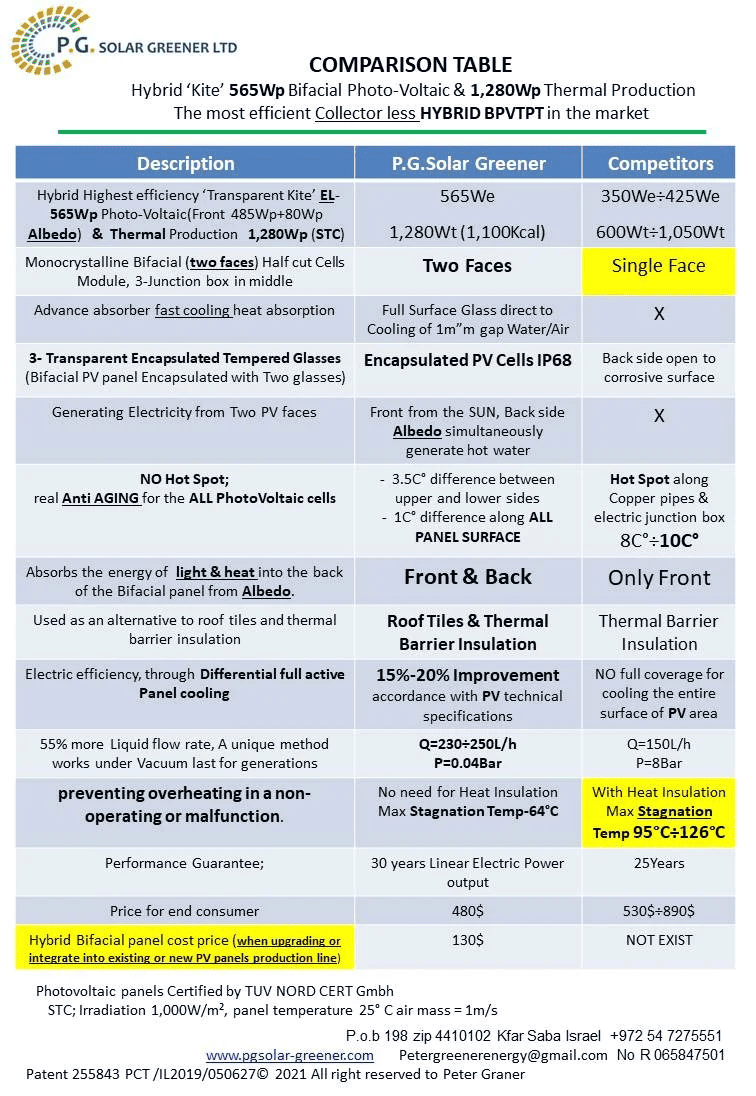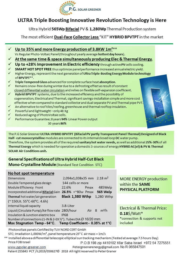 Mr. Peter Graner has designed and built a revolutionary Triple boosting hybrid BIFACIAL PV and TRANSPARENT Thermal solar panel. This hybrid BIFACIAL panel can produce 1,280Wp of Thermal energy and 565Wp of electric power (Front 485Wp + Back 80Wp Albedo).